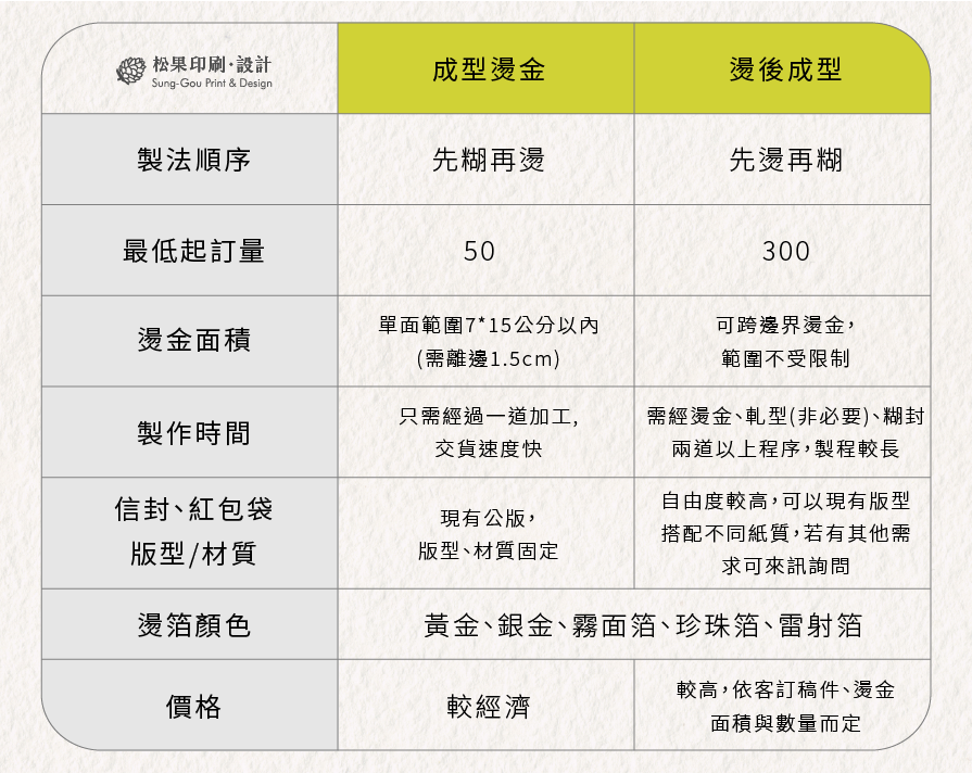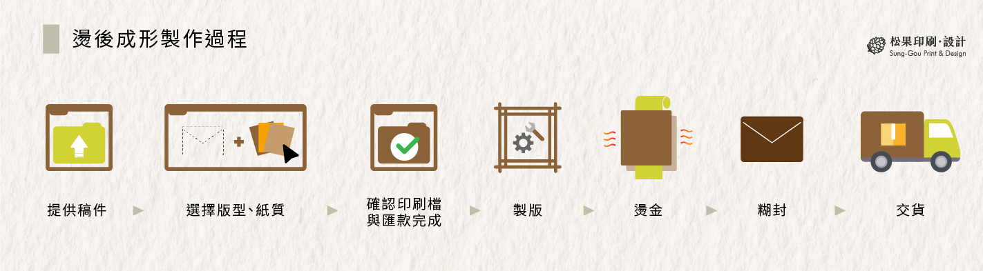 松果印刷設計承襲傳統燙印工法,以溫度與壓力精準調配,因應不同紙張材質與厚度。