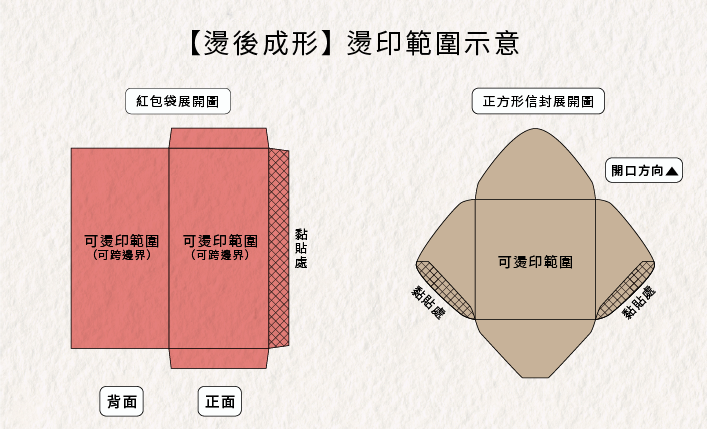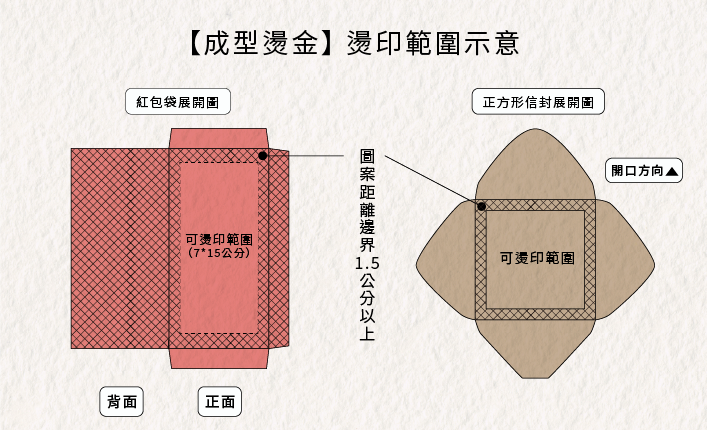 成型燙因採用松果印刷設計官網現有公版進行燙印,因此在燙印範圍上受到信封或紅包袋尺寸的限制,以紅包袋尺寸來說,建議燙印範圍在7*15公分內,並且圖案必須距離邊緣至少1.5公分,信封燙印圖案也必須距離邊緣至少1.5公分。
